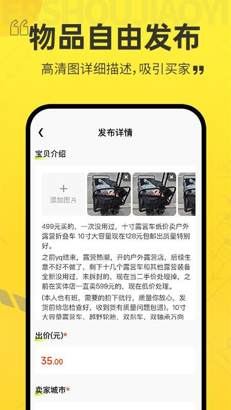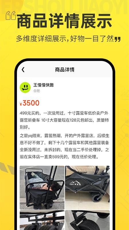 1、商品发布:通过拍照、添加描述和定价等简单几步,即可快速上架闲置物品,支持多图展示与分类标签。
