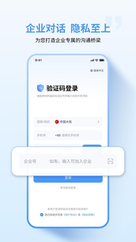 1、软件仅支持企业内部人员使用,输入企业号即可认证加入,享受优质功能服务。