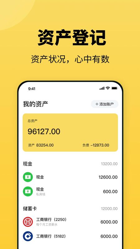 4、多账户资产管理:支持同步管理银行卡、信用卡、微信、支付宝、现金等多种账户类型,实时更新各账户余额与资产总额,提供完整的资产视图,让用户全面了解财务状况。