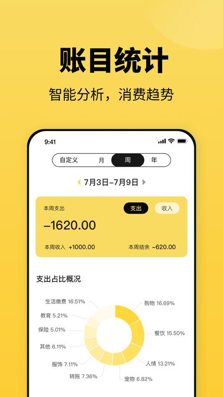 3、可视化账目统计:通过智能算法自动生成饼图与柱状图等可视化报表,直观展示消费占比与趋势变化,支持按周月年不同周期进行统计分析,帮助用户快速识别主要消费领域并优化支出结构。